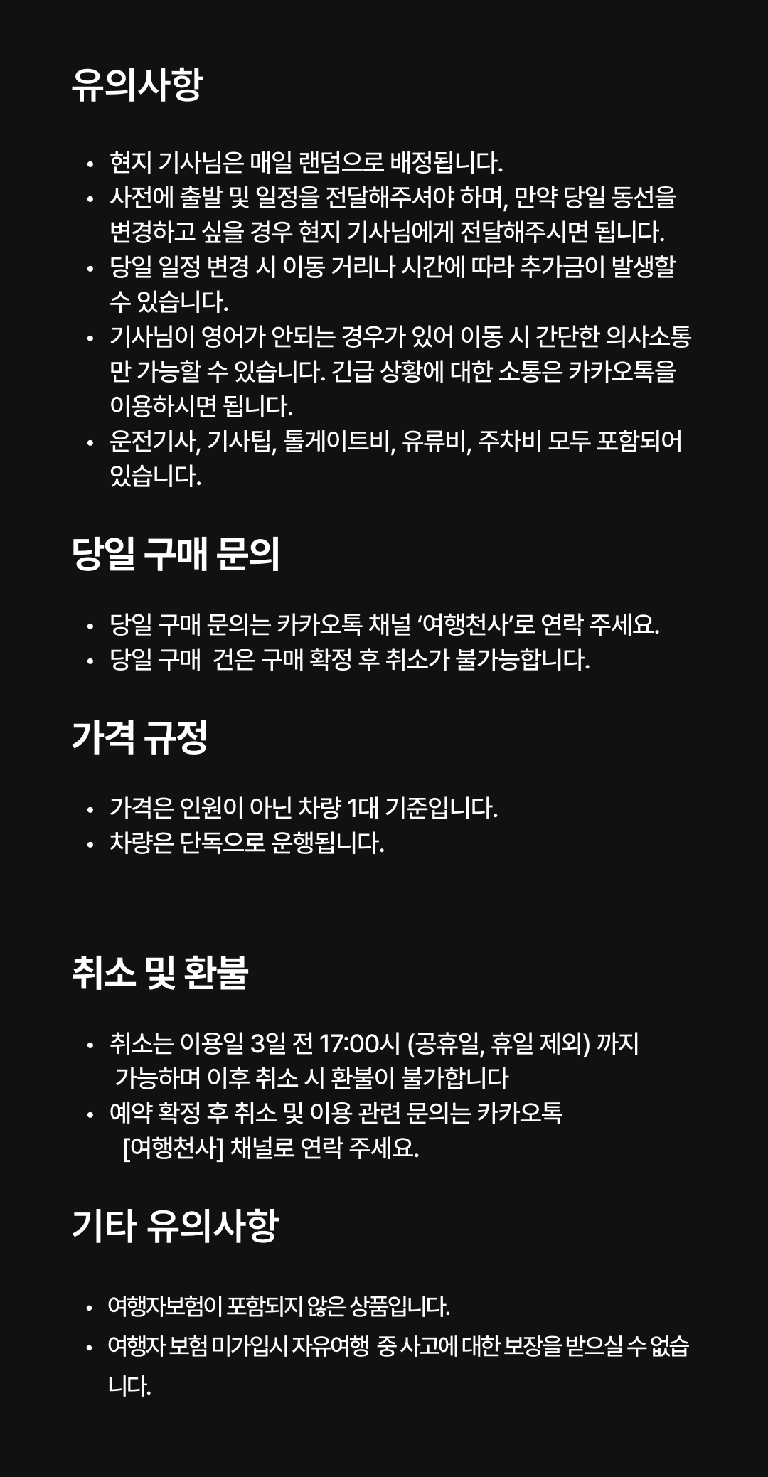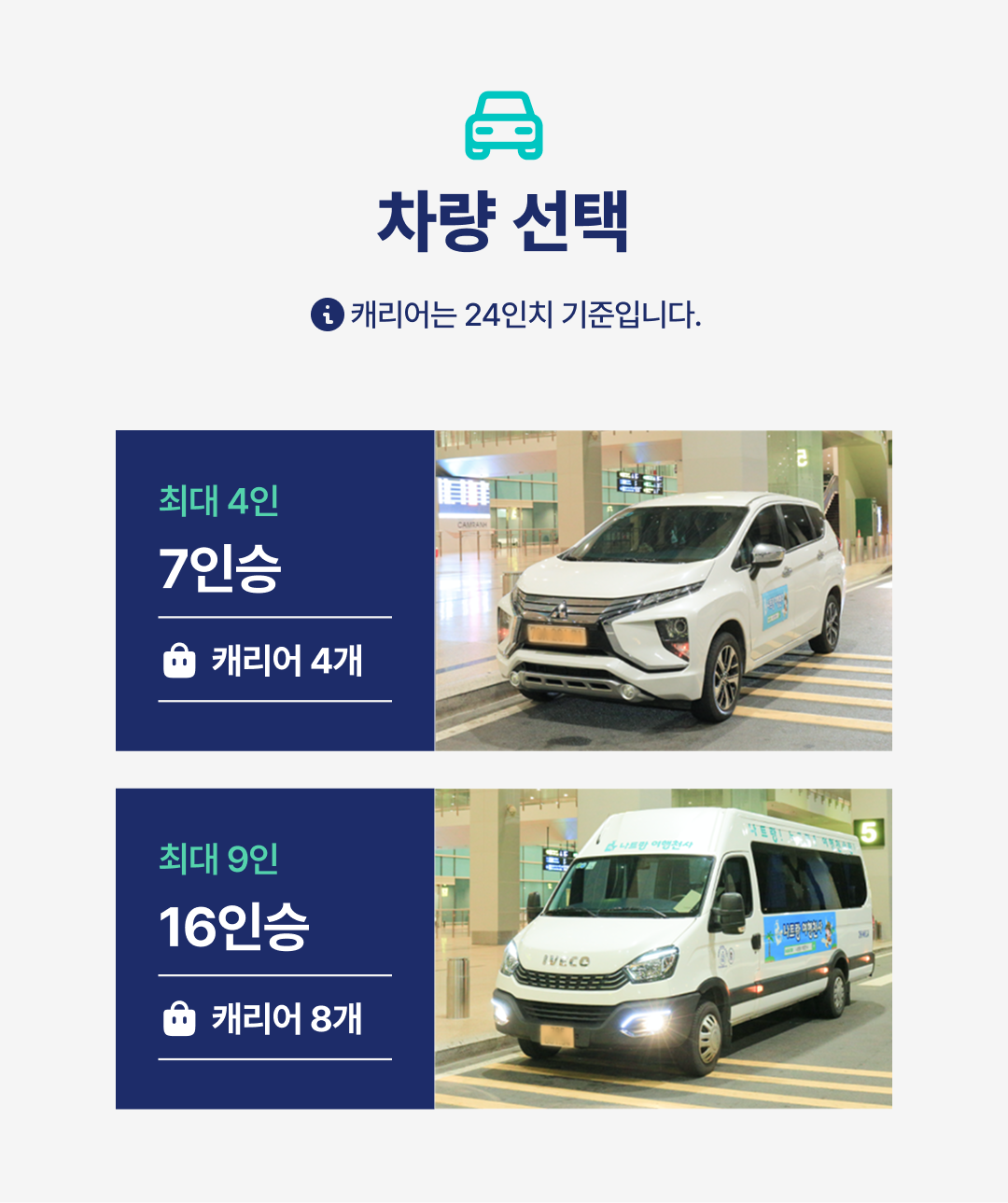 ✔ 차량은 인원 및 수하물 기준에 맞게 선택해 주세요.