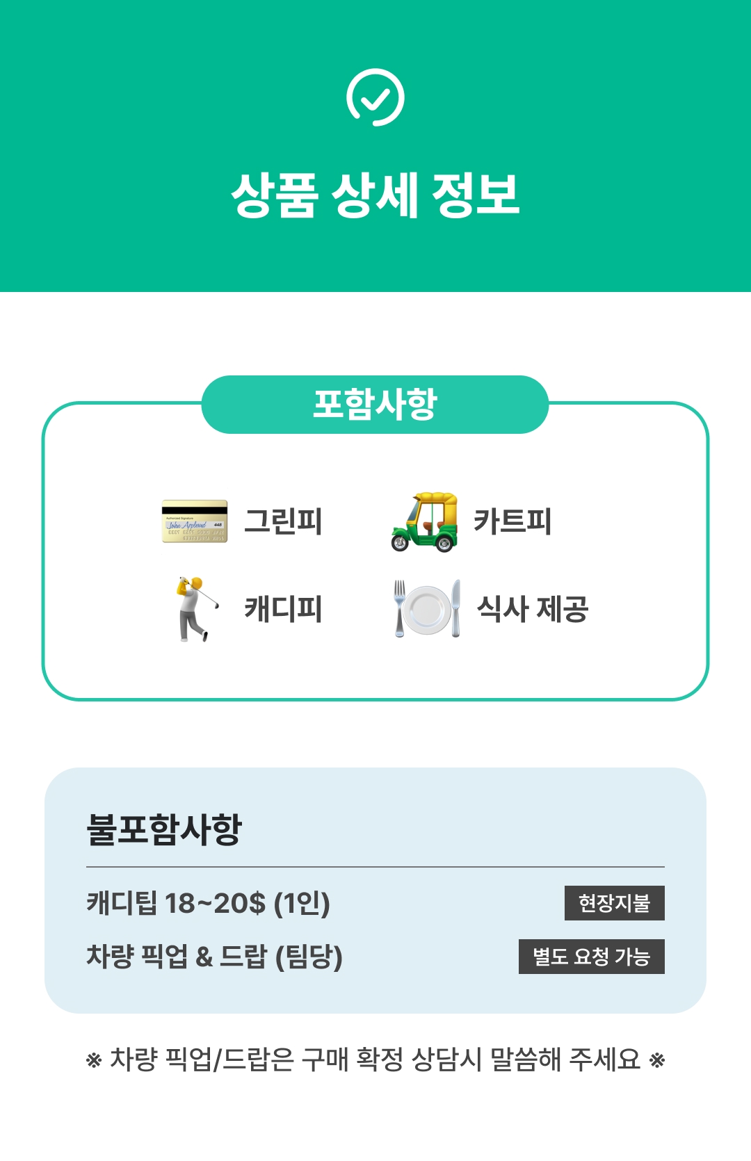 - 차량 픽업/드랍은 예약 후 상담 시 추가 요청 가능합니다.